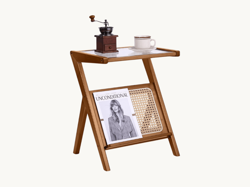 A rattan side table is one of those pieces that earns its place in a room through sheer versatility. This one pairs a glass top with a bamboo rattan frame and an L-shaped lower shelf — so you get a surface for your lamp or drink, plus display storage underneath for a trailing plant or a stack of vintage magazines. The proportions are perfect for beside a sofa or reading chair, and the glass top keeps it from feeling visually heavy in a small space. A practical piece that looks genuinely beautiful.
