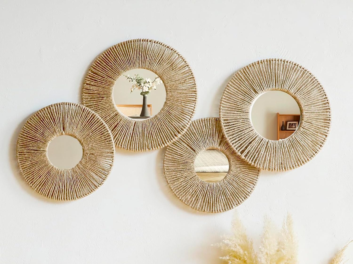 Wall baskets are one of those trends that sounds unusual until you see them done well — and then you immediately want them on every wall in your home. This set of four handwoven wicker baskets comes with small jute-framed mirrors in the center of each one, creating a layered, gallery-wall effect that reads as both decorative and artisanal. Arrange them in a loose cluster above a sofa or console table. The natural tones work with everything, and the mirrors add just enough light-reflecting interest to keep the arrangement from feeling flat.